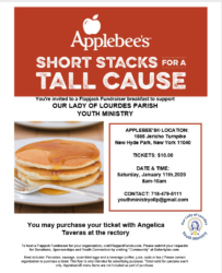 As part of our 95th anniversary, we are having a fundraiser breakfast at Applebees in support of our Youth Ministry initiatives. Join us for a delicious breakfast- pancakes, sausage, eggs, and a beverage. The breakfast will be on Saturday, January 11th from 8-10 am in Applebee’s on Jericho Turnpike. Tickets are $10 and can be purchased at the door the day of the event or at the Parish rectory.