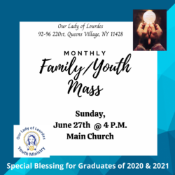 Join us for our June family/youth mass on Sunday the 27th at 4 p.m. Everyone is welcome. There will be a special blessing for graduates of 2020 and 2021.